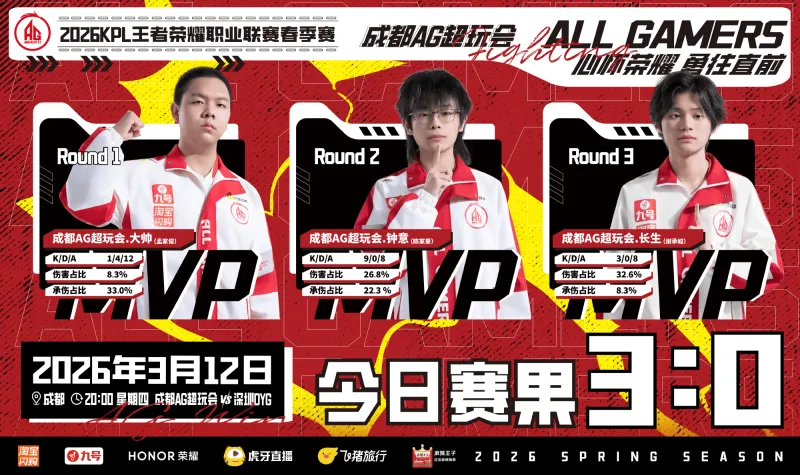今日胜局的MVP给到了AG大帅11、成都AG_钟意 和AG长生